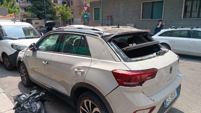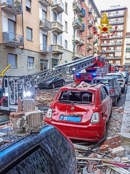 Durante la defragazione detriti e macerie sono precipitati in strada e nel cortile, danneggiando diverse autovetture.
