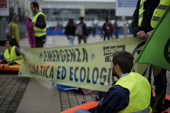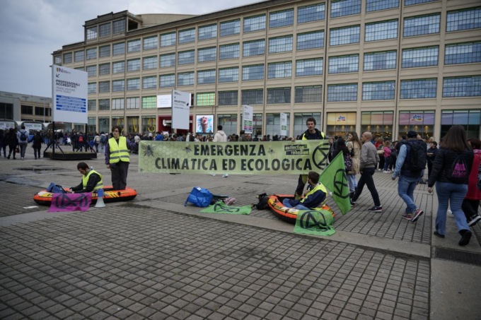 Con l’azione di oggi Extinction Rebllion si rivolge invece “agli invitati e partecipanti al Salone affinché usino la propria voce per denunciare le responsabilità del nostro governo di fronte alle tragedie che già oggi colpiscono il nostro territorio” dichiara Davide, uno degli attivisti presenti.