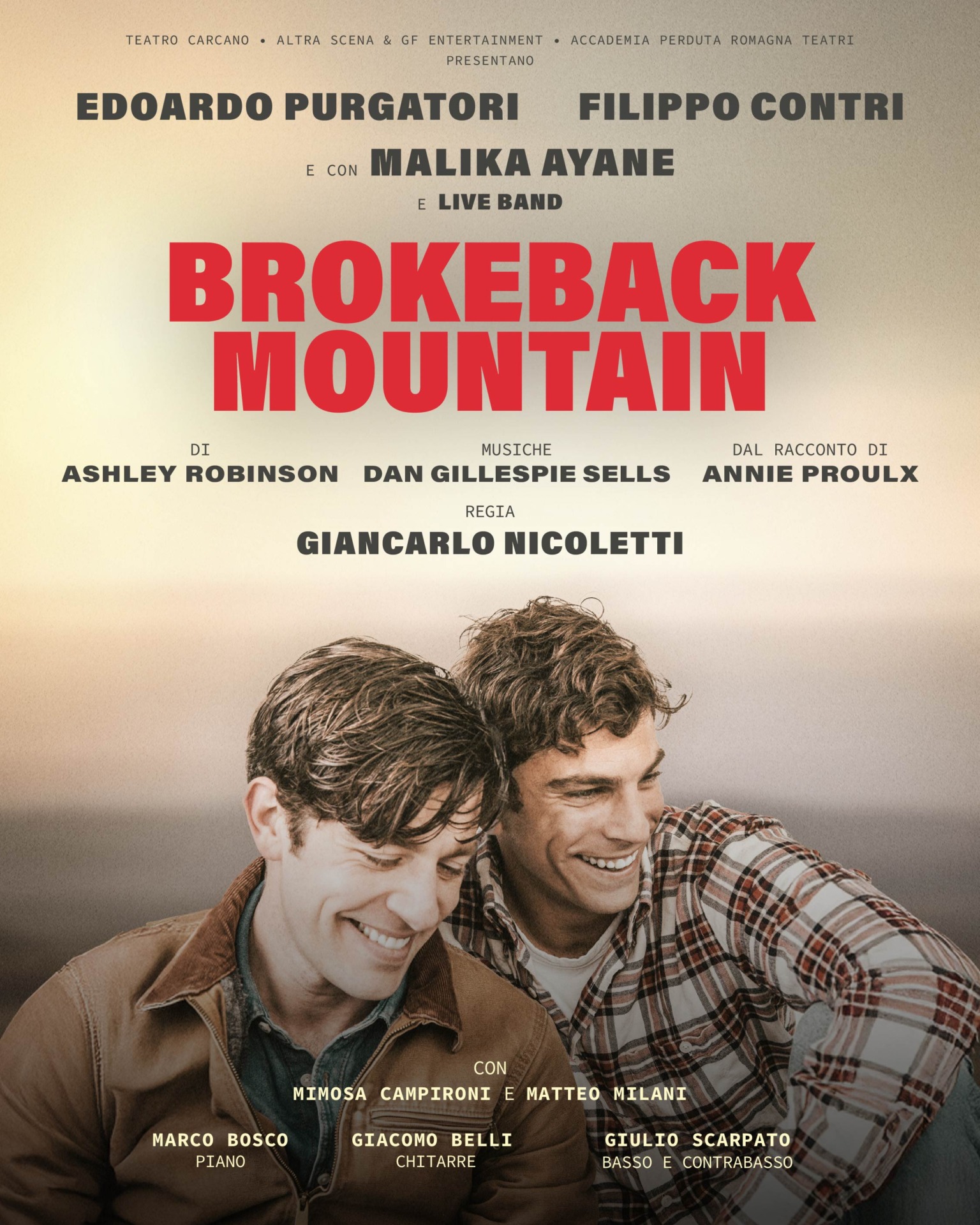 Un’indimenticabile storia di amore, lotta e accettazione. Per la prima volta in tour in Italia nella stagione 2025/26, “Brokeback Mountain” – basato sul racconto di Annie Proulx, adattato da Ashley Robinson e a vent’anni dal pluripremiato film omonimo – si trasforma in una sontuosa produzione teatrale con musiche dal vivo. Una “play with music” intima e spettacolare in cui i brani originali di Dan Gillespie Sells, interpretati da Malika Ayane e una live band, si intrecciano in modo indissolubile alla storia, tracciando paesaggi sconfinati e dando voce al tumultuoso mondo interiore di Ennis e Jack. Nei ruoli dei protagonisti, due giovani attori dal grande carisma e con solide esperienze alle spalle al cinema e in teatro: Edoardo Purgatori (“Diamanti”, “Siccità”) e Filippo Contri (“Vita da Carlo”, “Amici per caso”). Accanto a loro, in scena anche Mimosa Campironi e Matteo Milani. La regia e l’adattamento italiano sono affidati a Giancarlo Nicoletti (“1984”, “I due Papi”, “Elena la matta”).