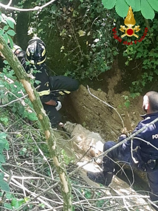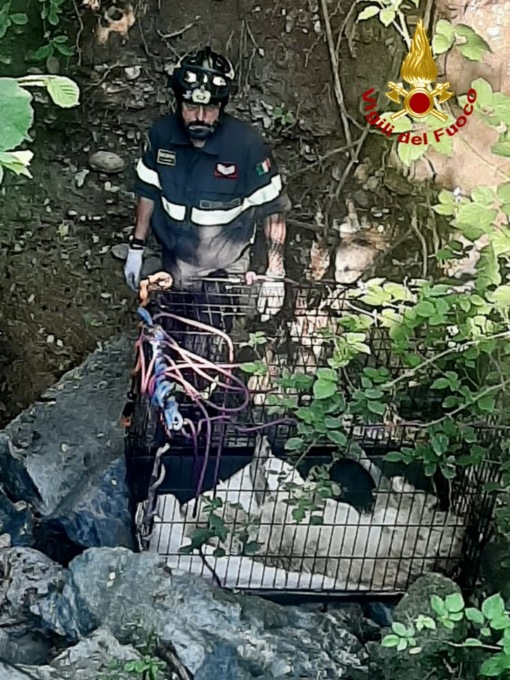 Tutto è iniziato quando un escursionista, accompagnato da un altro cane, si è accorto dell’animale in difficoltà richiamato dall’attenzione del suo compagno a quattro zampe che si era avvicinato al malcapitato. Ha così lanciato l’allarme.