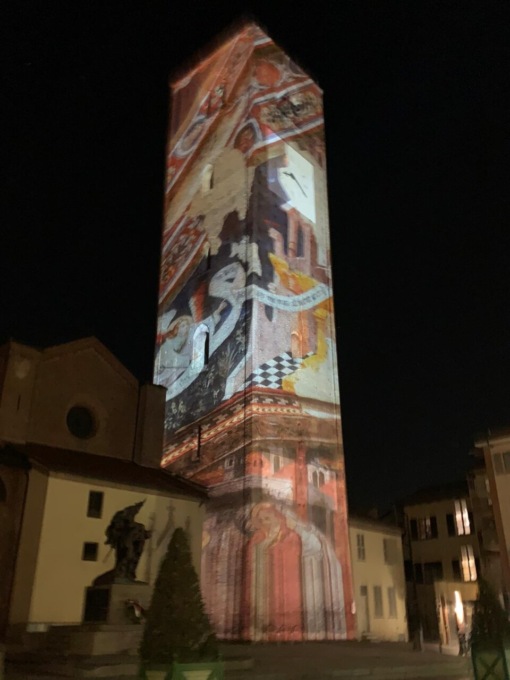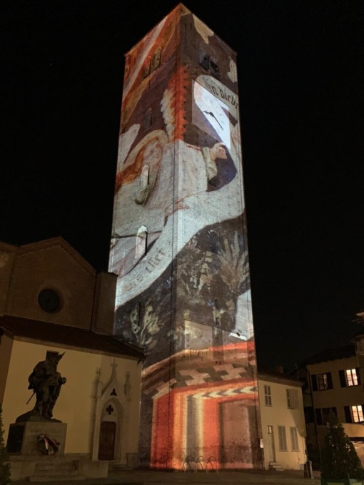 Il progetto si completa quest’anno con il videomapping sulla facciata della Chiesa di San Guglielmo e con quello sul campanile del Duomo. Questi ultimi due sono stati realizzati dall’artista chierese Francesco Granieri e dal suo team F2Alab.