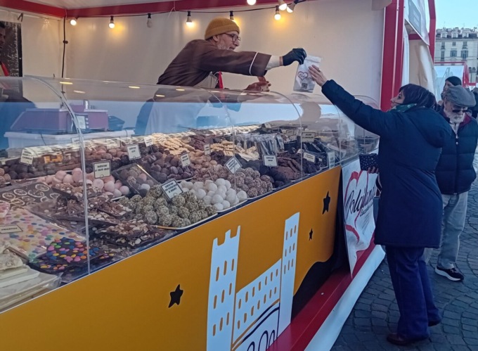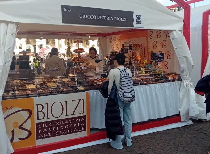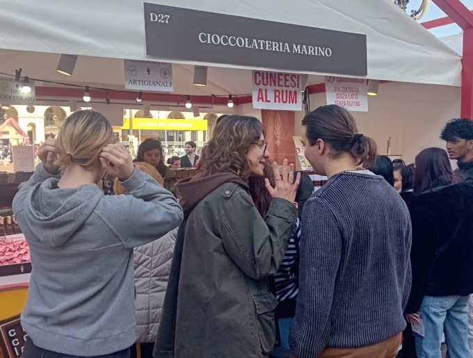 “Ho preso dei Cuneesi al rum. Non sono facili da trovare in giro, quelli buoni. Quest’anno trovo che i prezzi siano un po’ alti e penso anche che ci siano pochi espositori, ma io qui ci vengo sempre, sa… ho dei gusti difficilissimi in tema cioccolato.”