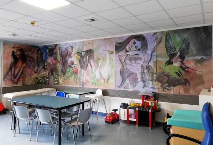 Si tratta in totale di 6 nuovi pannelli, ispirati all’audiolibro “Fiabe di un mondo nuovo” di Bruna Macaluso – LarEditore. I pannelli, appena collocati lungo un’intera parete della sala giochi del reparto, a breve saranno accompagnati da un codice a barre, attraverso il quale l’adulto che accompagnerà il piccolo paziente potrà collegarsi con il proprio cellulare alla versione audio del libro di fiabe al quale si rifanno i dipinti. “Lo scopo” ha spiegato Luca Roasio, Direttore del reparto pediatrico dell’ospedale pinerolese “è quello di sollecitare gli adulti ad un utilizzo positivo dei dispositivi digitali, che possono trasformarsi da surrogati della presenza genitoriale in strumenti educativi, di crescita, insieme genitori e figli, in linea con le indicazioni regionali sulla promozione della salute in questo ambito.”