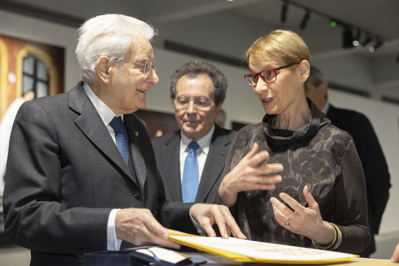 Il Presidente della Repubblica Sergio Mattarella con Franca Maino, Presidente Fondazione Ufficio Pio, in occasione della cerimonia per il 430° anniversario della Fondazione Ufficio Pio e della Compagnia di San Paolo