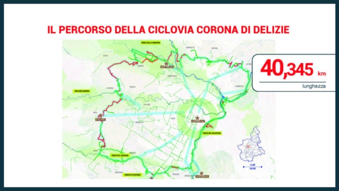 La “Corona” si svilupperà per poco più di 40 chilometri fra Venaria, Rivoli e Stupinigi e attraverserà il parco del Sangone, offrendo anche la possibilità di una deviazione e di una sosta tra il verde del parco del castello degli Orsini.