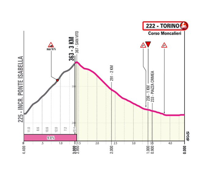 Da Venaria Reale a Torino, con il via alle 13.50. Tecnicamente definita una “tappa molto mossa”, dopo una fase di avvicinamento pianeggiante di circa 45 chilometri. Prima di entrare nel circuito finale di circa 30 chilometri si affrontano due GPM di difficoltà crescente, la salita di Berzano di San Pietro e la salita di Superga dal versante di Baldissero Torinese che presenta pendenze meno arcigne del versante classi da Torino. Prima di passare una prima volta sul traguardo si affronta lo strappo di San Vito, da superare due volte, e l’ultima a 3 chilometri dall’arrivo.