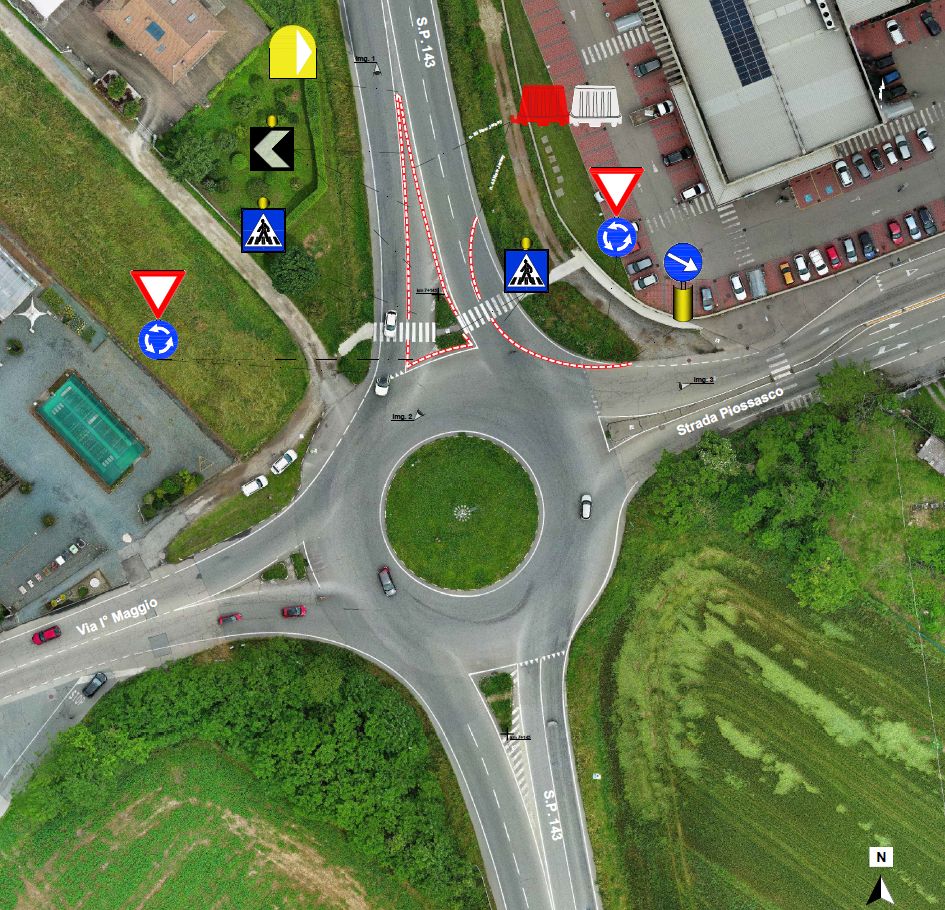 L’esito positivo della prova ha portato alla progettazione definitiva delle modifiche, che comprendono la realizzazione di nuove isole spartitraffico, il rifacimento della pavimentazione stradale dell’anello giratorio, l’installazione di nuovi punti luce a LED ed implementazione della segnaletica indicante l’attraversamento sospesa, oltre al completo aggiornamento della segnaletica orizzontale e verticale.