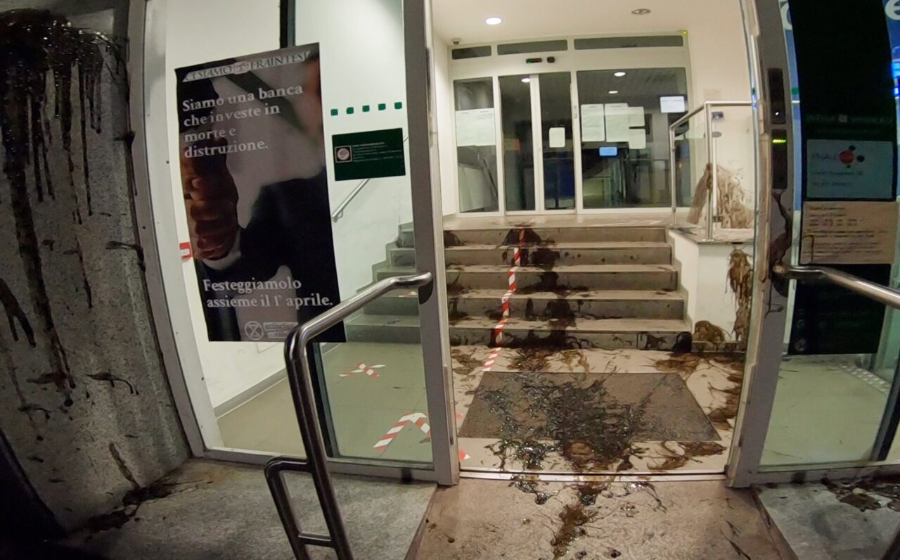 A partire dalle prime luci dell’alba, Torino è stata protagonista di diverse clamorose azioni portate avanti dagli attivisti. Davanti le entrate di alcune filiali di Intesa Sanpaolo e Unicredit, sono comparsi adesivi, manifesti e scritte effettuate con stencil e gesso che recitano “Questa banca usa i tuoi soldi per finanziare il collasso climatico”. Allo stesso tempo, alcuni attivisti travestiti in maniera rudimentale da polpi hanno effettuato una performance con del petrolio lavabile (che però sembra in realtà ben altro…) nella filiale Intesa Sanpaolo per contestare lo sfruttamento dei giacimenti di greggio e il conseguente inquinamento atmosferico causato dalle auto. Punto focale della giornata di mobilitazione il presidio davanti al grattacielo Sanpaolo dove, a partire dalle 10 di questa mattina, sono in corso diverse azioni dimostrative. In accordo con il tema del pesce d’aprile, davanti all’ingresso del grattacielo è stata installata una grande lisca di pesce.