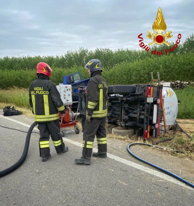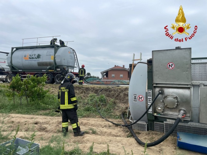 Poco prima di mezzogiorno squadre dei vigili del fuoco del comando di Torino sono, infatti, dovute intervenire a Santena in via circonvallazione per un incidente stradale che ha visto coinvolta una autocisterna uscita di strada e poi finita ribaltata in un campo.