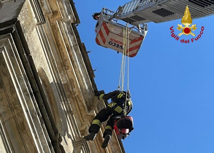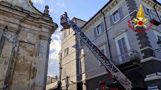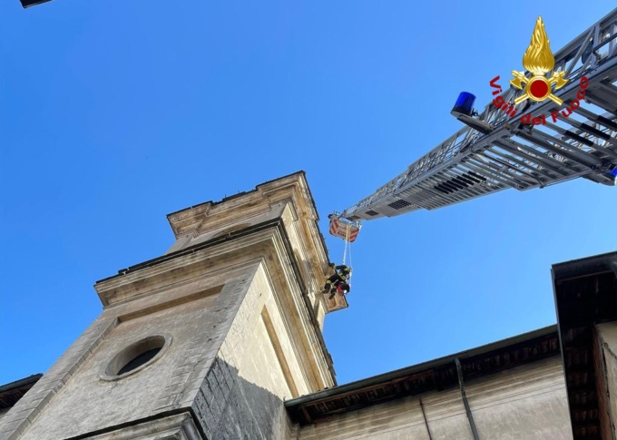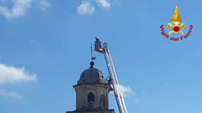 Il vento e le intemperie dei giorni scorsi le avevano rese pericolanti e per operare in sicurezza è stata usata l’autoscala. Sul posto è intervenuto anche il sindaco Simone Ballari, il tecnico comunale ed il parroco Maurizio Napoli.