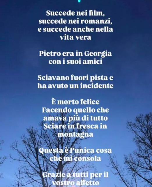“Pietro è morto felice, facendo quello che amava più di tutto: sciare in fresca in montagna. Succede nei film, succede nei romanzi e succede anche nella vita reale. L’unica cosa che mi consola è che sia morto felice. Eri la persona migliore che conoscevo, figlio mio adorabile. Questa è la nostra ultima foto insieme, in uno dei tanti momenti splendidi, noi due, in armonia. Grazie per tutto l’amore che mi hai dato e tutto ciò che mi hai insegnato”.