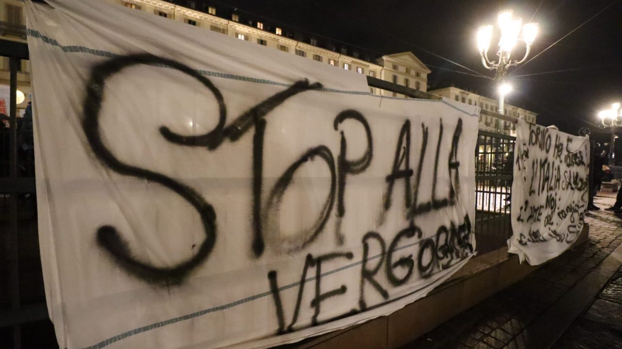 In piazza Vittorio tantissimi invece gli striscioni e i cartelli, anche se non c’è stata alcuna rivendicazione da parte di sigle partitiche, movimenti politici, associazioni o altro.