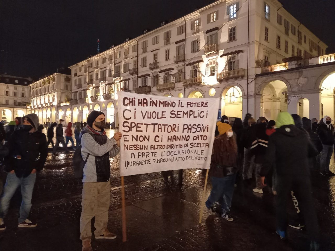 Soprattutto in piazza Castello – riempitasi già dalle 19.30, un’ora prima dall’inizio della manifestazione – il clima si è rivelato molto teso e sono state schierate decine di poliziotti in tenuta anti-sommossa. Già, perché qui la manifestazione è stata indetta grazie al passaparola e a un volantino diffuso per le strade, ma senza alcuna rivendicazione: non si sa di preciso chi abbia promosso la protesta, ma in strada non sono mancati molti ubriachi e alcuni facinorosi, nessuno striscione, nessun contenuto “politico” esplicito. La sensazione è che molti non sapessero neppure bene perché fossero in piazza (il contesto alveo ideale per potenziali scoppi di violenza improvvisi).