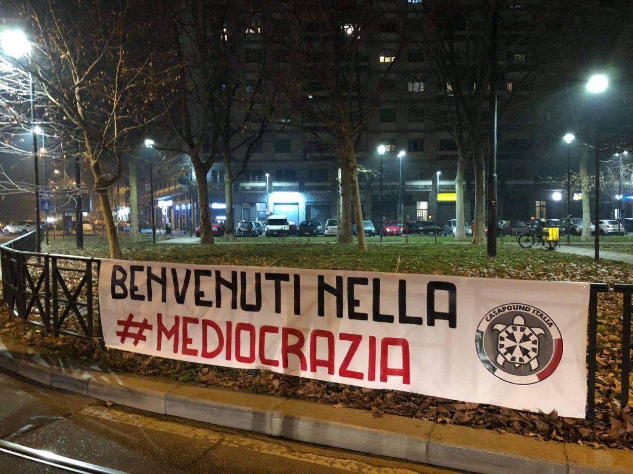 “Benvenuti nella mediocrazia”. È questo il testo degli striscioni comparsi questa mattina a Torino e provincia e in oltre 100 città italiane da nord a sud a firma CasaPound Italia.