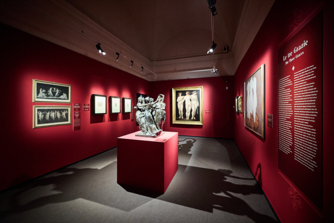 Questa sezione è dedicata alle tre Grazie: Eufrosine (la Gioia), Aglae (lo Splendore) e Talìa (la Prosperità). Figlie di Zeus e della titanide Eurinome, dea di tutto ciò che esiste, le tre fanciulle sono state considerate fin dall’antichità la personificazione della bellezza e della grazia femminile, spesso associate a Venere e Cupido. Tra le opere presenti emergono tre disegni di Antonio Canova appartenenti alle collezioni della Biblioteca Reale: un nudo femminile, un gruppo di ninfe con un amorino e un disegno a carboncino, ritenuto uno dei più intensi tra gli i fogli che Canova disegnò per il celebre gruppo marmoreo de “Le Tre grazie”.