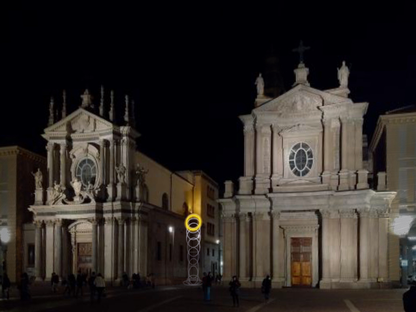 L’opera Bouncing the Ball rappresenta l’azione del rimbalzo e la deformazione di una pallina nell’istante dell’impatto: il gesto tecnico diventa forma essenziale, un congelamento luminoso del tempo. La Luce si trasforma, evolvendo da un’ellisse a un cerchio perfetto – una forma universale e ricorrente nella pratica dell’artista. Il cerchio è anche buco, soglia, principio di permeabilità e passaggio. In Piazza San Carlo, l’opera dialoga con le due chiese gemelle, le cui facciate presentano grandi rosoni ellittici, forme che ritornano nel rimbalzo luminoso in evoluzione dinamica.