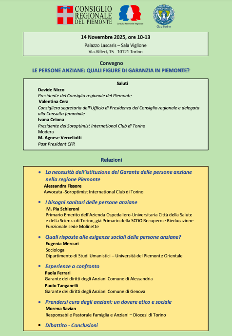 Il Soroptimist International d’Italia Club di Torino, in occasione del 75° anniversario della sua fondazione, organizza un convegno dedicato al tema della tutela dei diritti delle persone anziane, in collaborazione con la Consulta femminile regionale.