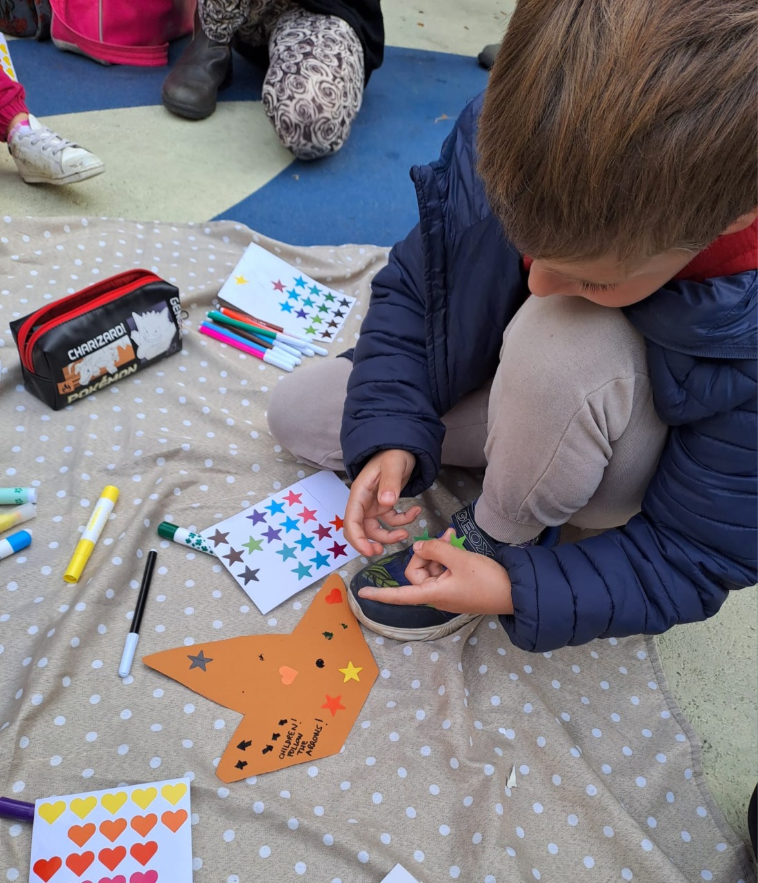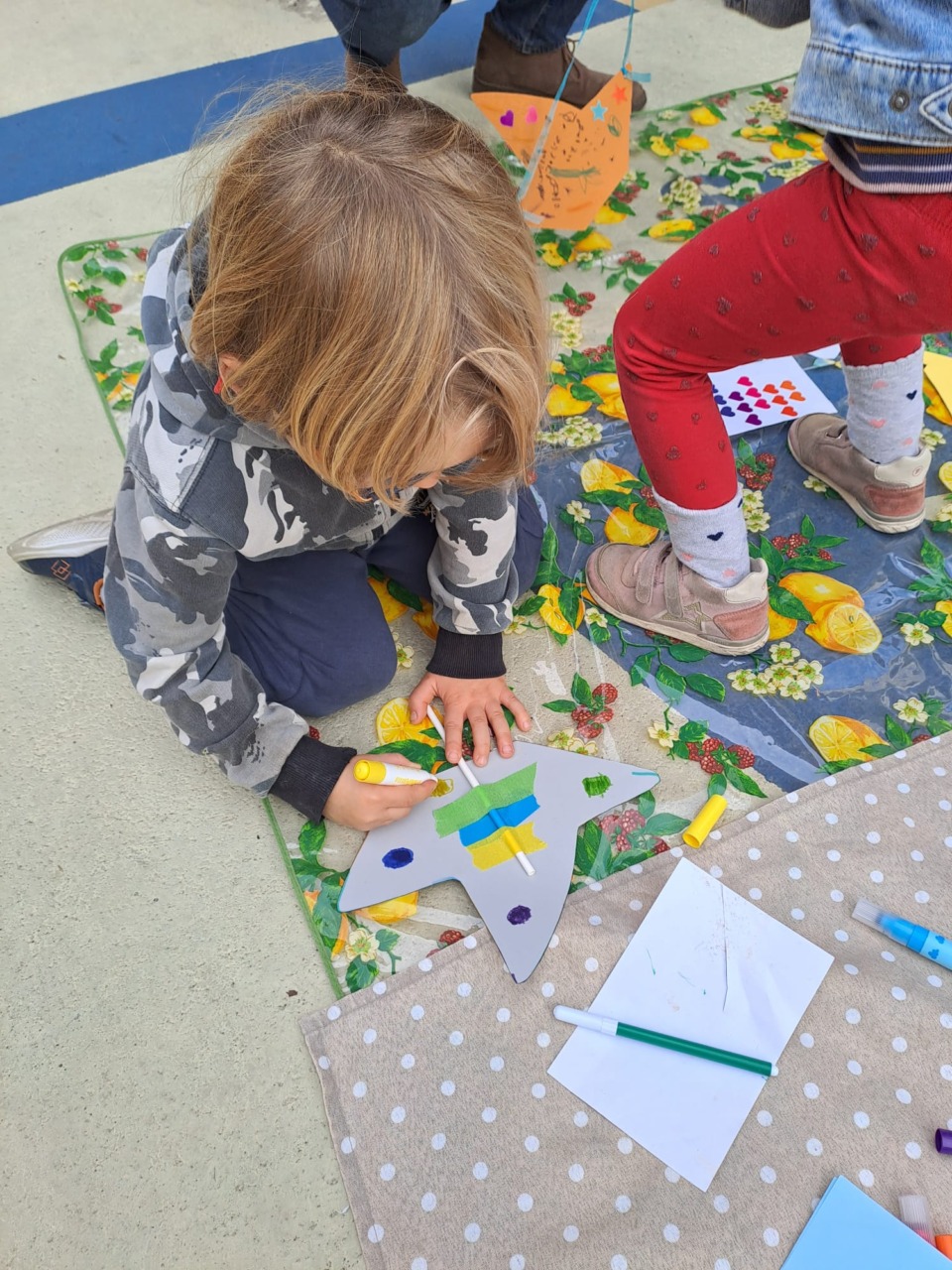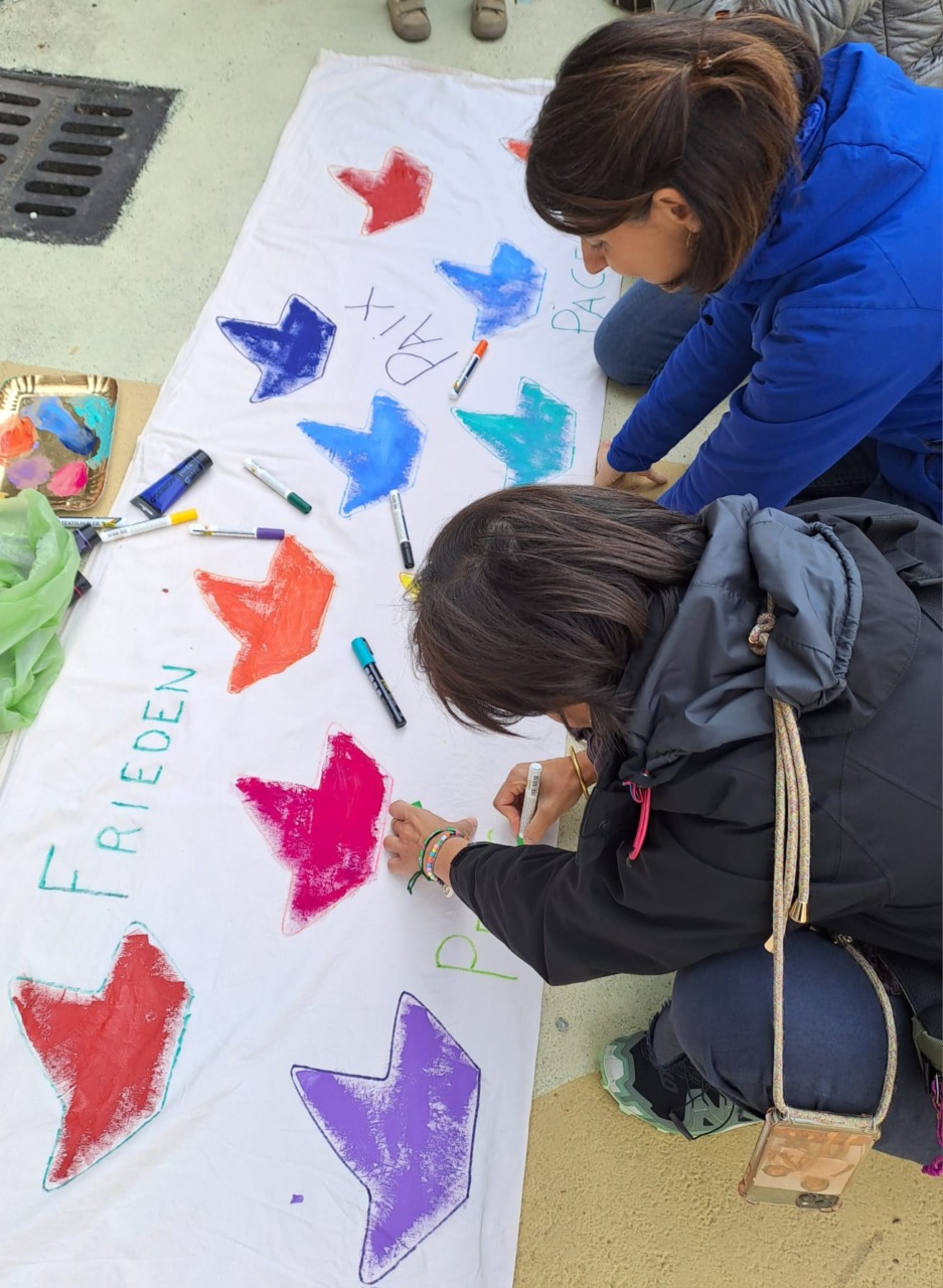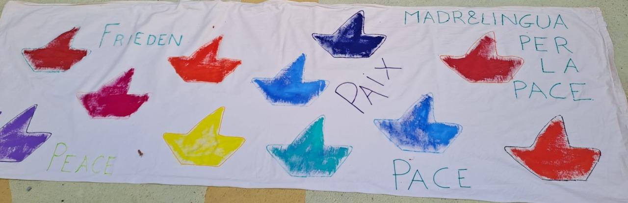 C’è un clima di tensione oggi in città e spiegarlo non è facile. Ci pensano le maestre madrelingua coadiuvate dai genitori a trovare la risposta giusta ad ogni domanda, in un’ora vengono realizzati manifesti colorati per la pace e si parte per il corteo, ognuno coi suoi tempi e i suoi bisogni di bimbo.