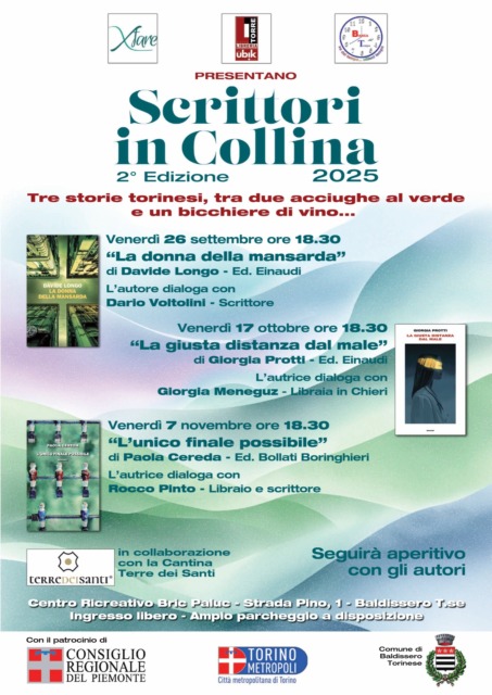 Si svolge a Baldissero Torinese la seconda edizione di Scrittori in Collina 2025, la rassegna letteraria che presenta tre storie torinesi. L’evento è sostenuto dalla Città metropolitana di Torino, insieme al Consiglio Regionale del Piemonte e al Comune di Baldissero Torinese.