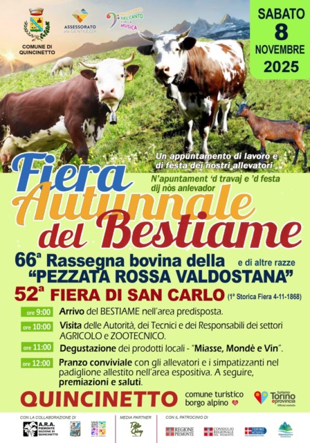 Sabato 8 novembre tornerà a Quincinetto uno degli appuntamenti più attesi dell’autunno canavesano, la Fiera Autunnale del Bestiame, nel cui ambito si svolgono la 66ª edizione della Rassegna bovina della Pezzata Rossa Valdostana e di altre razze e la 52ª edizione della Fiera di San Carlo. L’evento unisce il lavoro quotidiano degli allevatori ad un momento di festa e di orgoglio per una comunità che non ha mai dimenticato le proprie radici agricole e montane.