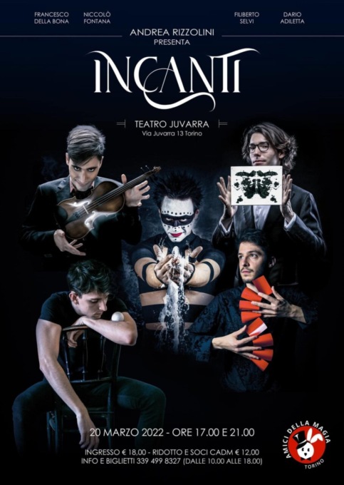 Arriva in anteprima nazionale al Teatro Juvarra di Torino Incanti, uno spettacolo che vede in scena cinque dei più bravi e giovani illusionisti italiani: il fantasista Dario Adiletta, il manipolatore Francesco Della Bona, il visionario Niccolò Fontana, il poetico Filiberto Selvi uniti da un sottile filo rosso svelato dal mentalista Andrea Rizzolini. Un viaggio di oltre settanta minuti nell’inesplorato mondo dell’incanto, magiche ed originali performance che interrogheranno sui sogni, sul rapporto che instaurano con le nostre vite e sul ruolo che essi hanno nel renderci ciò che siamo.