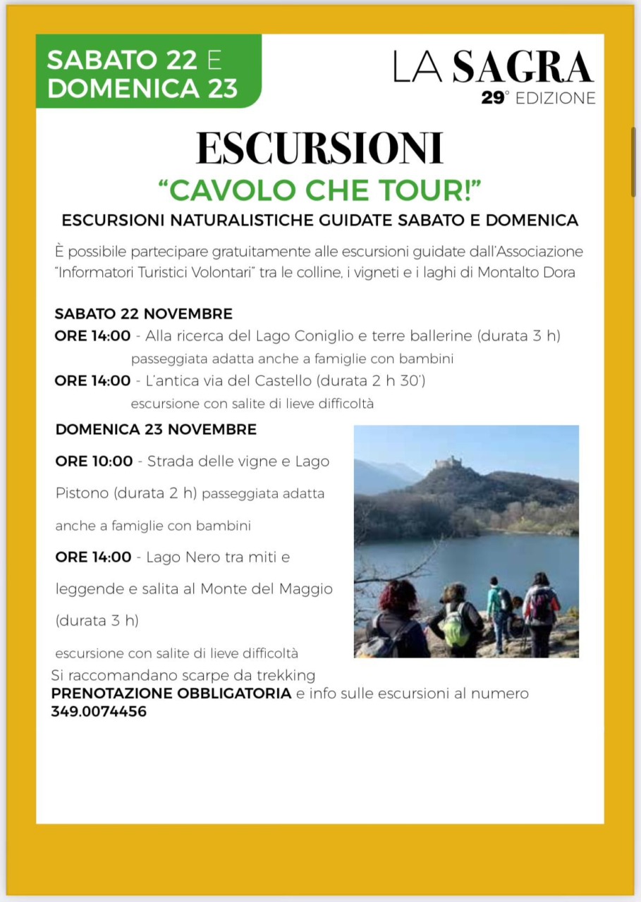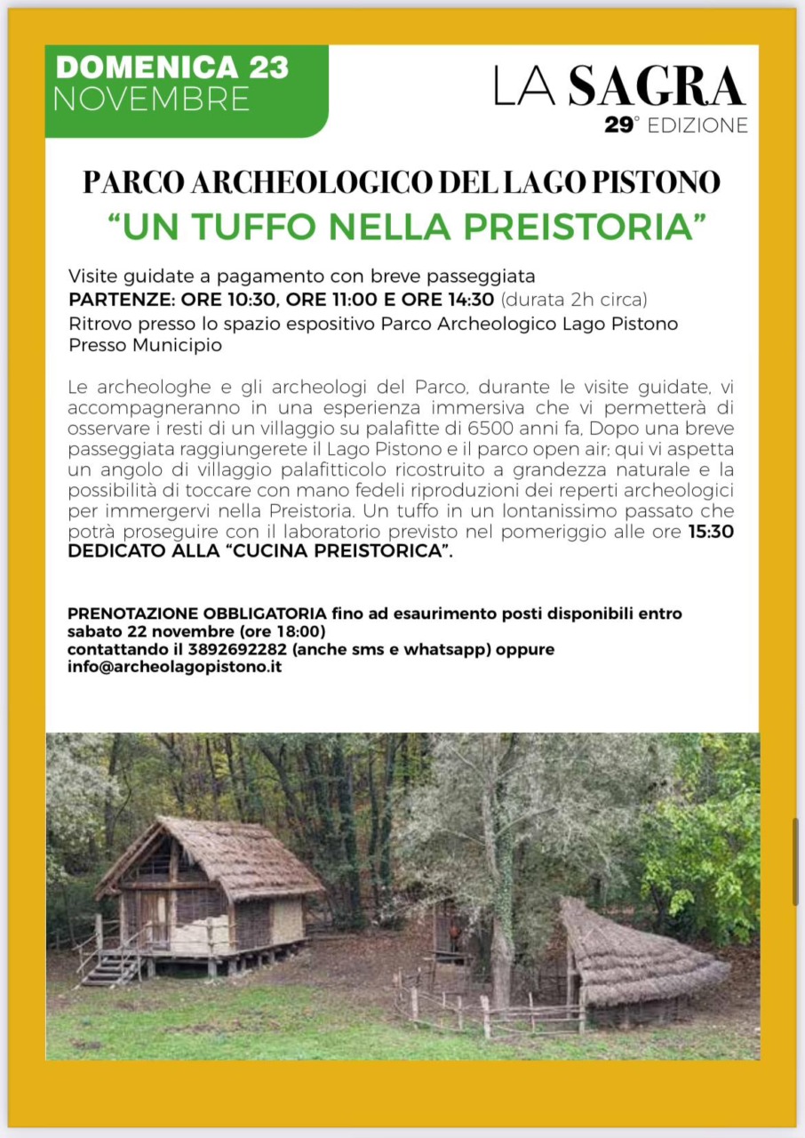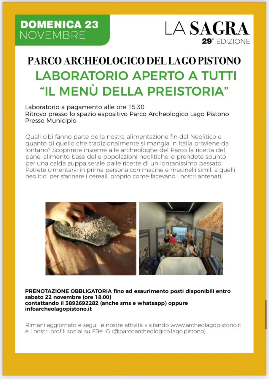 Le prenotazioni si raccolgono al numero telefonico 393-9089733. Tra le iniziative più attese figurano anche le escursioni naturalistiche gratuite “Cavolo che tour!” di sabato 22 e domenica 23 novembre. A seconda del percorso e della durata, le gite a piedi sono adatte alle famiglie, ma anche a chi è più allenato, spaziando dal Lago Coniglio con le Terre Ballerine alla Strada delle Vigne intorno al Lago Pistono, dal Lago Nero al Monte del Maggio. Le prenotazioni sono obbligatorie e si ricevono al numero telefonico 349-0074456. Domenica 23 sarà anche possibile visitare il parco archeologico del Lago Pistono, immerso tra colline, boschi e vigneti, prenotando al numero 389-2692282 o all’indirizzo e-mail info@archeolagopistono.it Un laboratorio pomeridiano a pagamento sarà dedicato al menù della preistoria.