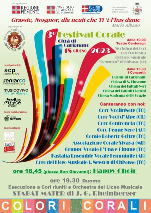 Dopo tre anni di stop dovuti alla pandemia, domenica 18 giugno ritorna finalmente il Festival corale Città di Carignano, organizzato dall’associazione di promozionale sociale Corale Carignanese con il contributo e il patrocinio del Comune e con il patrocinio della Città metropolitana di Torino.