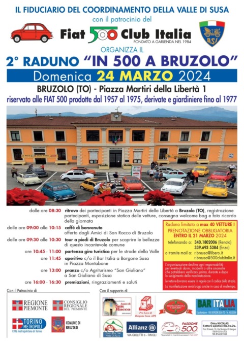 Domenica 24 marzo è una data da segnare per gli appassionati delle Fiat 500 storiche, quelle prodotte tra il 1957 e il 1977: è la data della seconda edizione del raduno “In 500 a Bruzolo”, patrocinato dalla Città metropolitana di Torino e organizzato da Renato Breusa, fiduciario per la Valle di Susa del FIAT 500 Club Italia, il più importante sodalizio di modello dedicato alla storica bicilindrica. Grazie all’impegno del locale Coordinamento, il FIAT 500 Club Italia, che ha sede a Garlenda (Savona), ha da sempre un occhio di riguardo per la Valle di Susa.