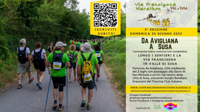 È fissato per domenica 25 giugno l’appuntamento podistico con la Francigena Marathon Val di Susa, camminata ludico-motoria non competitiva organizzata dall’associazione sportiva Iride di Rivoli. Le iscrizioni si sono chiuse domenica 11 giugno, ma anche solo assistere al passaggio dei camminatori sarà uno spettacolo. La Francigena Marathon Val di Susa è patrocinata dalla Città metropolitana di Torino e avrà come teatro un percorso che va da Avigliana a Susa, toccando i punti più caratteristici della Valle di Susa, con il passaggio alla Sacra di San Michele, raggiunta grazie al suggestivo Sentiero dei Principi.