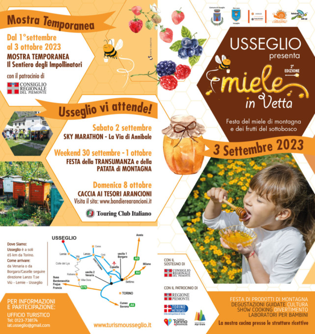 Con il patrocinio della Città metropolitana di Torino, domenica 3 settembre a partire dalle 9 nell’antico complesso parrocchiale di Usseglio torna la festa “Miele in Vetta”, dedicata ai mieli di montagna e dei frutti del sottobosco che, nella prima edizione tenutasi lo scorso anno, aveva ottenuto un ottimo successo.