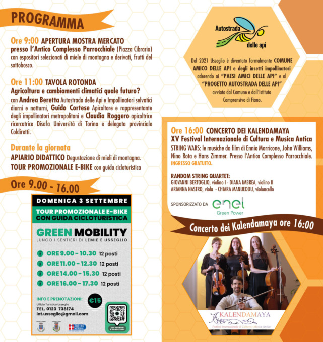 A fare da corollario alla Fiera del Miele i tour promozionali con le e-bike, con l’accompagnamento di una guida escursionistica del progetto Green Mobility lungo i sentieri di Lemie e di Usseglio, ma anche i menù a tema nei ristoranti locali e il concerto pomeridiano del gruppo Kalendamaya, nell’ambito del XV Festival Internazionale di cultura e musica.