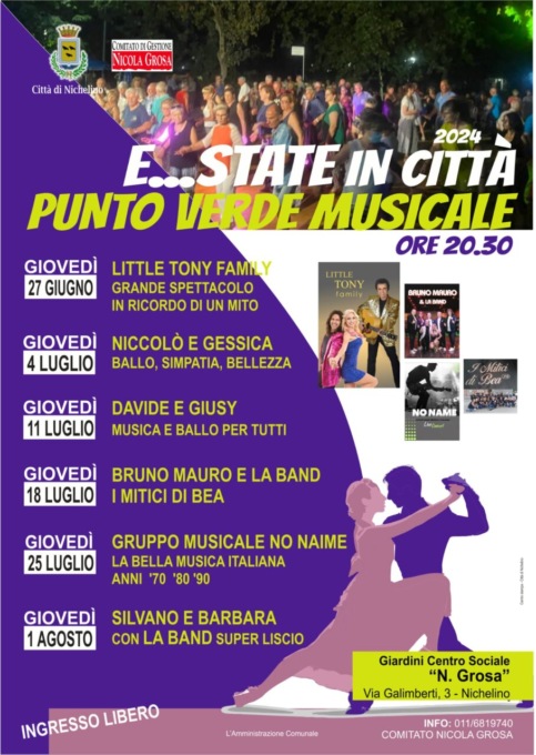 Da giovedì 27 giugno, per 6 giovedì di fila, sino al prossimo 1 agosto 2024, sono in programma presso il Centro Grosa di Nichelino, diversi eventi che faranno rivivere la bella musica di un grande Mito della Canzone Italiana e il Rock’n Roll di Elvis Presley.