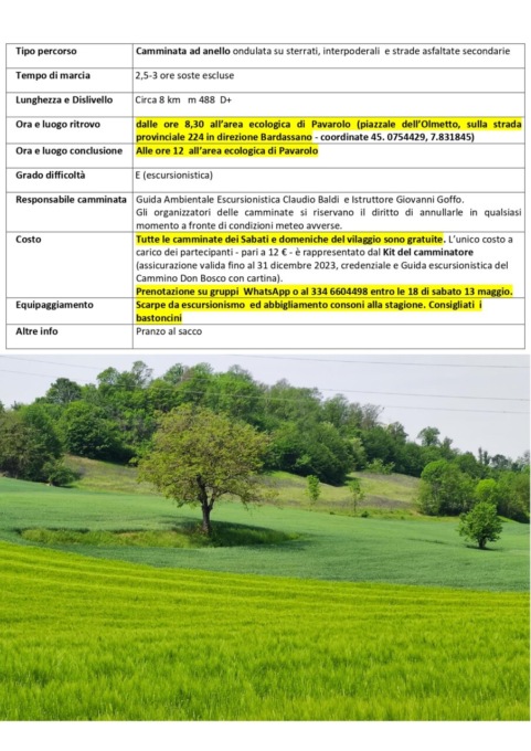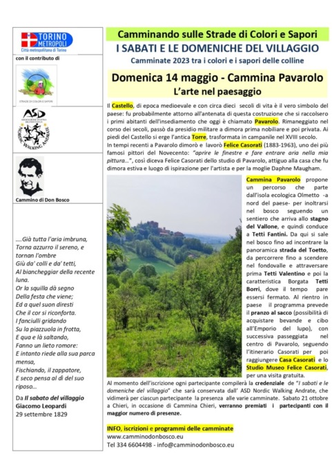 Prosegue domenica 14 maggio a Pavarolo l’iniziativa “I sabati e le domeniche del Villaggio”, che propone quattordici camminate a partecipazione gratuita per scoprire le colline di Torino e del Chierese a passo lento, seguendo alcuni dei percorsi del Cammino di Don Bosco, promosso dalla Città metropolitana di Torino e dai Comuni aderenti alle Strade di Colori e Sapori del Chierese e del Carmagnolese.