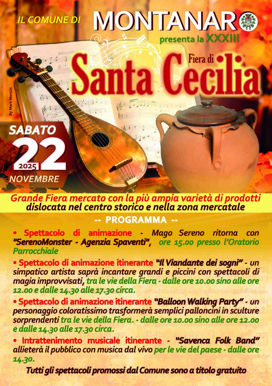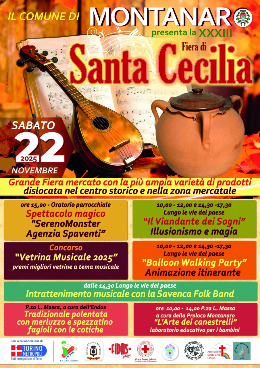 Sabato 22 novembre a Montanaro torna la Fiera di Santa Cecilia, un evento promosso dall’amministrazione comunale e dalla Pro Loco che unisce tradizione agricola, cultura popolare, sapori del territorio e impegno sociale in una giornata imperdibile per residenti e visitatori. Nata come appuntamento contadino dedicato al mondo agricolo e al bestiame, oggi la fiera, patrocinata dalla Città metropolitana di Torino, conserva il suo spirito originario arricchendosi con una mostra mercato agricola e zootecnica, il mercatino con prodotti tipici, artigianato e abbigliamento, gli stand gastronomici con i piatti della tradizione piemontese, le degustazioni e le dimostrazioni della preparazione dei canestrelli, la degustazione delle frittelle di mele, la musica popolare, gli intrattenimenti e le attività per le famiglie.Il centro del paese si animerà fin dal mattino con bancarelle, vetrine a tema, profumi autunnali e suoni che evocano un passato rurale ancora molto vivo.